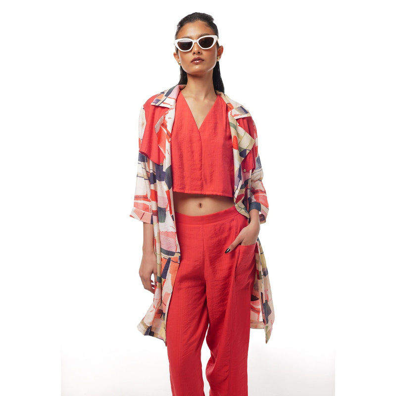Description : Crimson Features A Printed Open Jacket Adorned With Distinctive Red Flap Detailing's On The Back And Front And Pockets For Added Convenience. The Jacket Is Paired With A Vibrant Red V-Neck Top And Matching Red Holly Pants Creating A Cohesive And Stylish Look. Perfect For Turning Heads The Crimson 3-Piece Set Seamlessly Blends Modern Design With Vibrant Colour Making It An Essential Addition To Your Wardrobe.