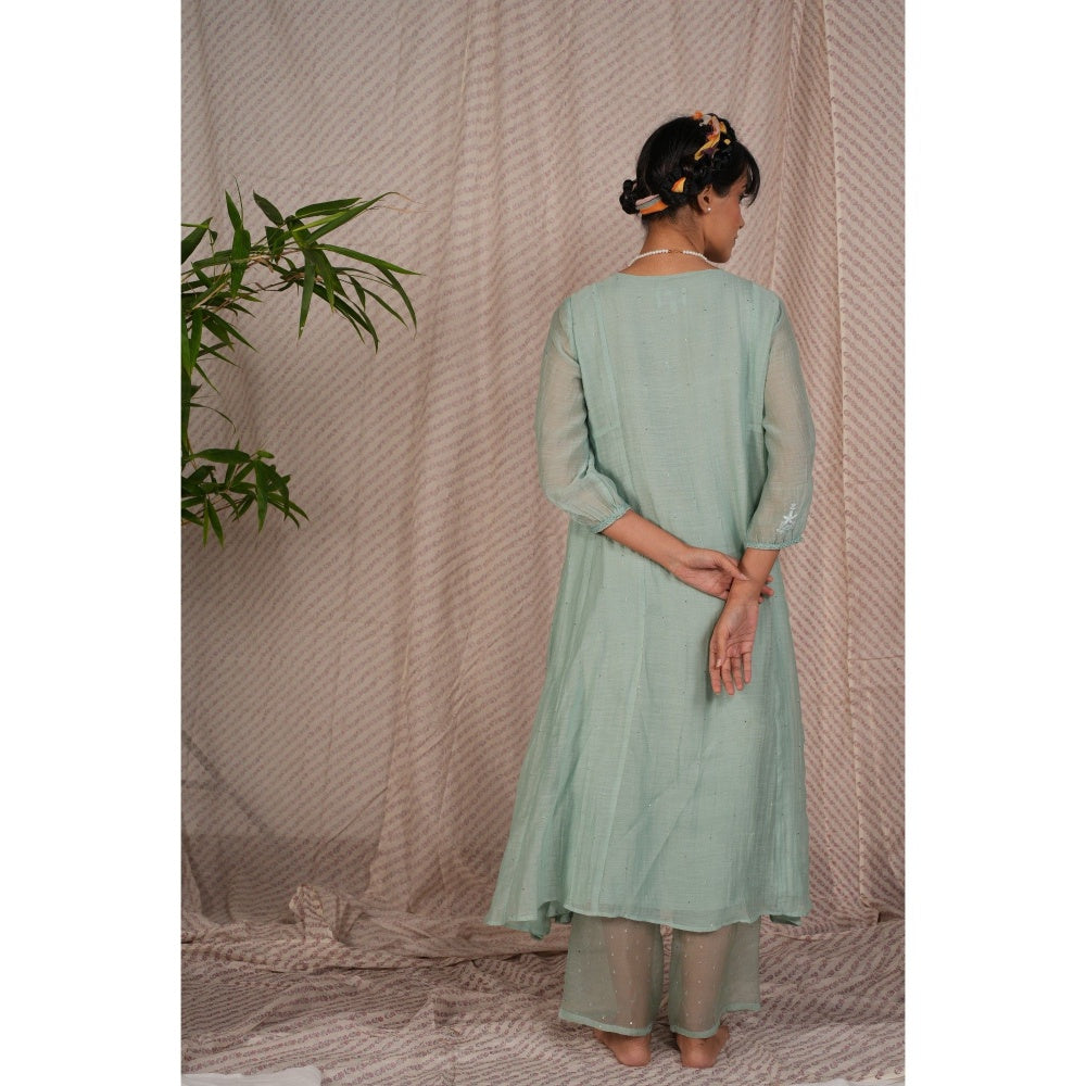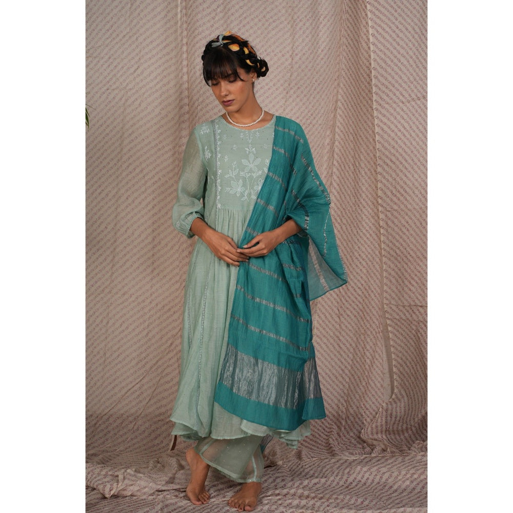 PANTS AND PAJAMAS Aqua Chikan Embroidered Kurta (Set of 3)