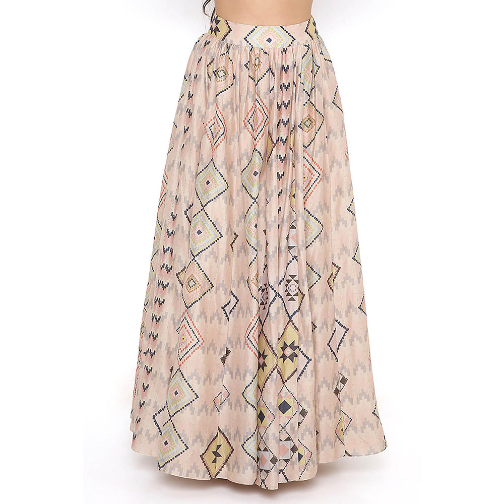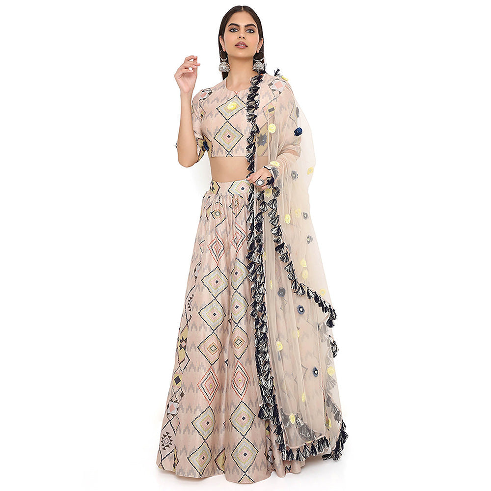 Beige Print Embroidered Blouse with Lehenga and Dupatta (Set of 3)