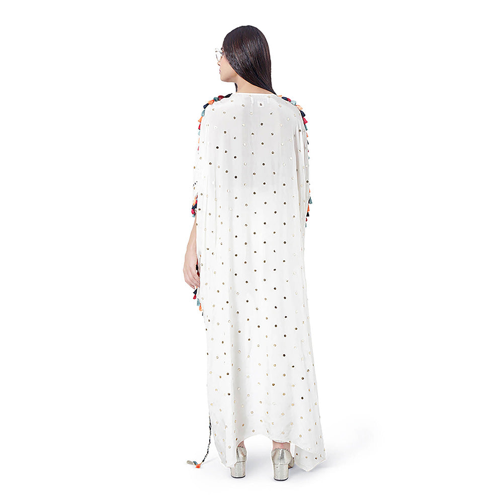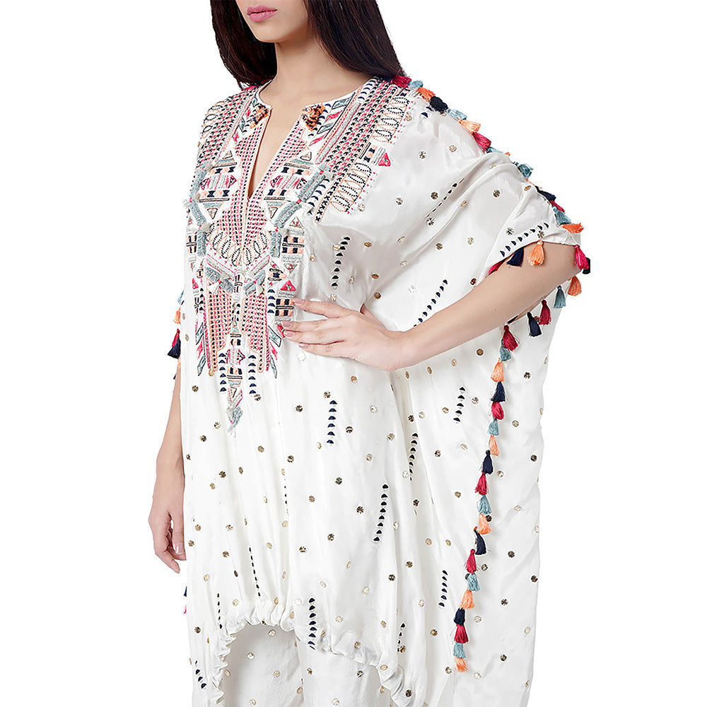 Description : Chalk White Colour Dot Mukesh Silk Yoke Embroidered High-Low Kaftan with Colourful Tassels and Drawstring Details and Jogger Pantplease Note: Top Is Free Size and Bottom Will Be As Per The Standard Size Guide Provided.