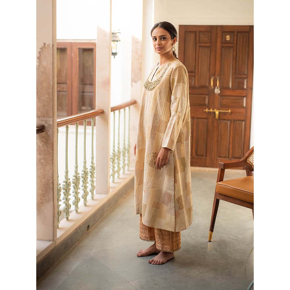 Renata + Rafa - Beige Upcycled Patchwork Kurta with Silk Pants (Set of 2)