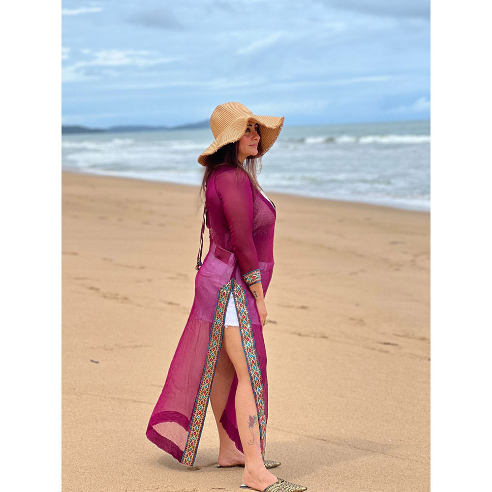 Description : Burgundy full-sleeved sheer tunic and blouse set with an aztec sequin and rhinestone appliqu embroidered trim
