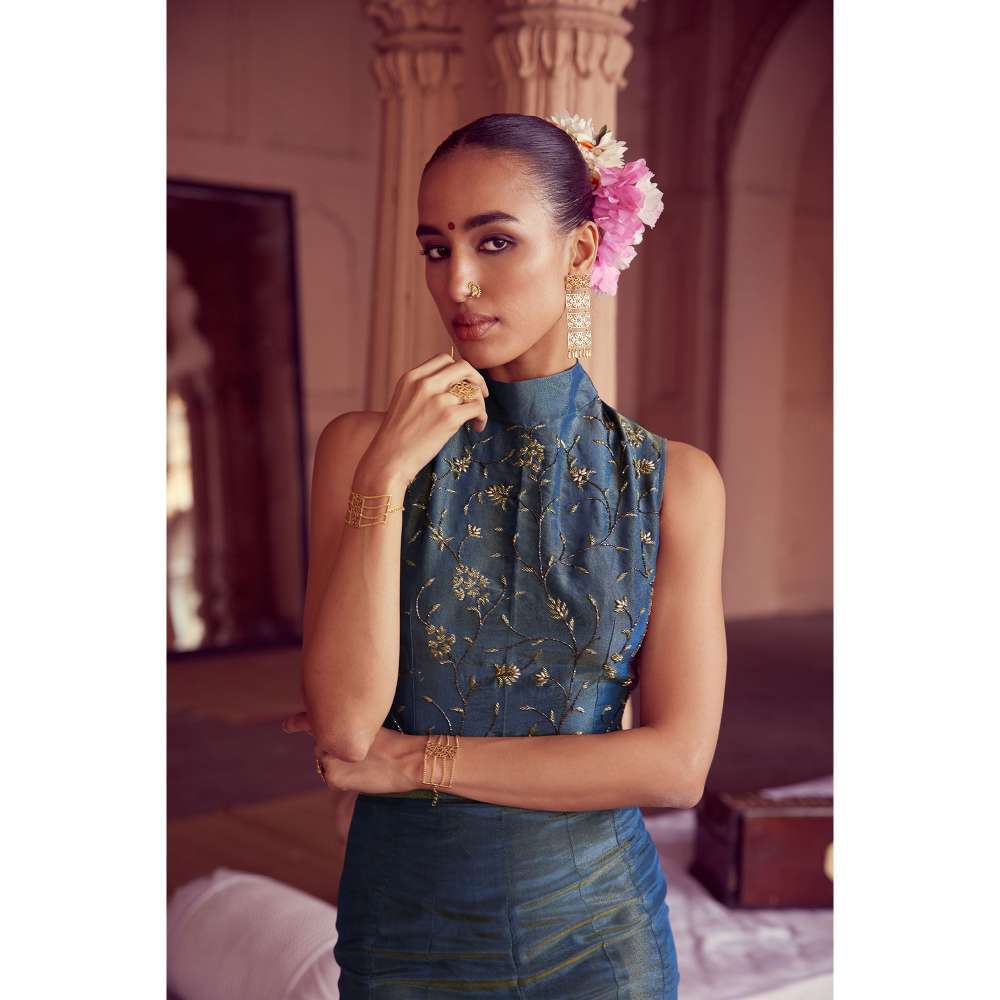 Description : Our Kurma Set Which Takes Its Inspiration From Ardhnareshwar, Is Crafted From The Finest Tissue. Featuring An Intricately Embroidered High Neck Top, Paired with An Ever So Glamorous Kalidar Flared Pan.