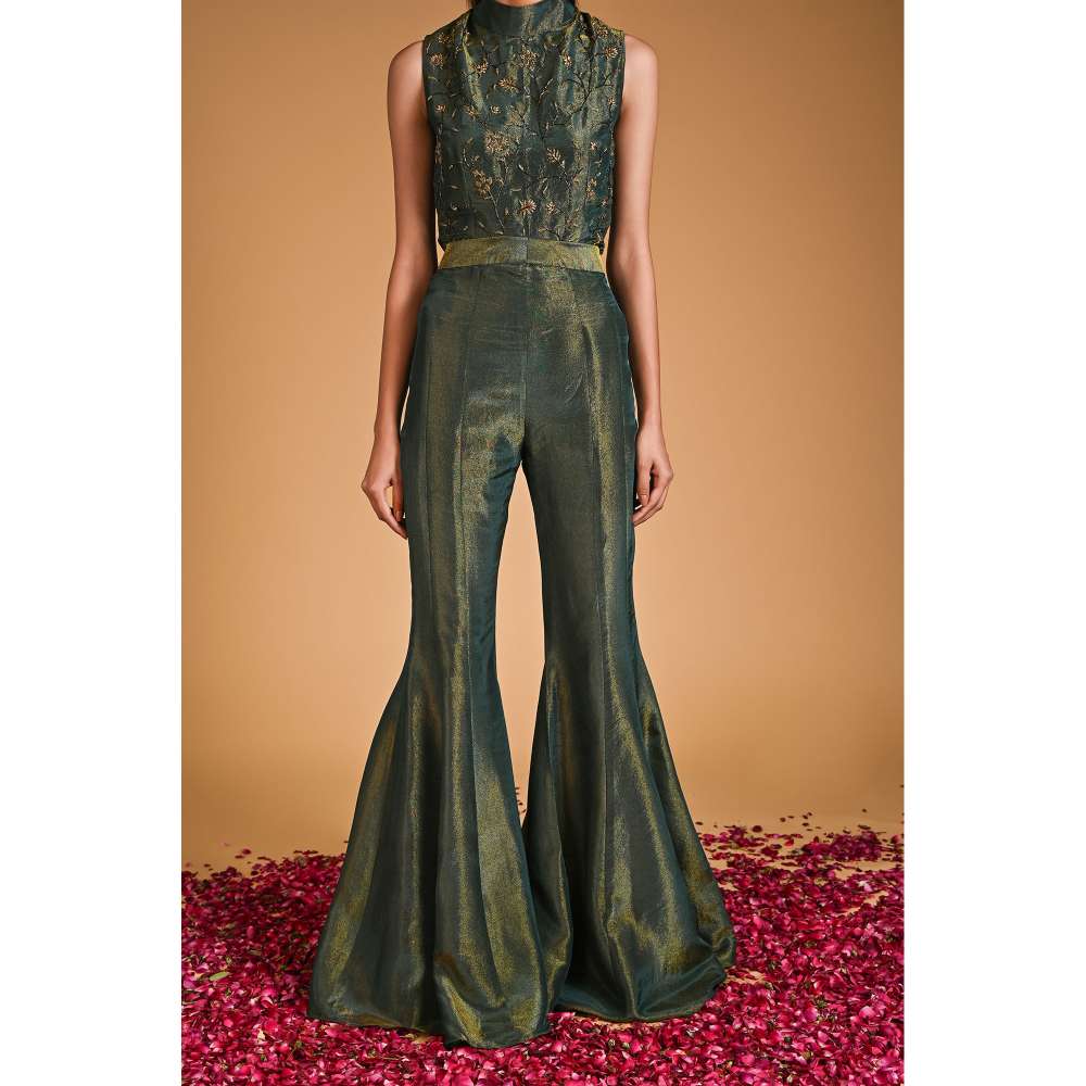 Green Embroidered Sleeveless Top with Pant (Set of 2)