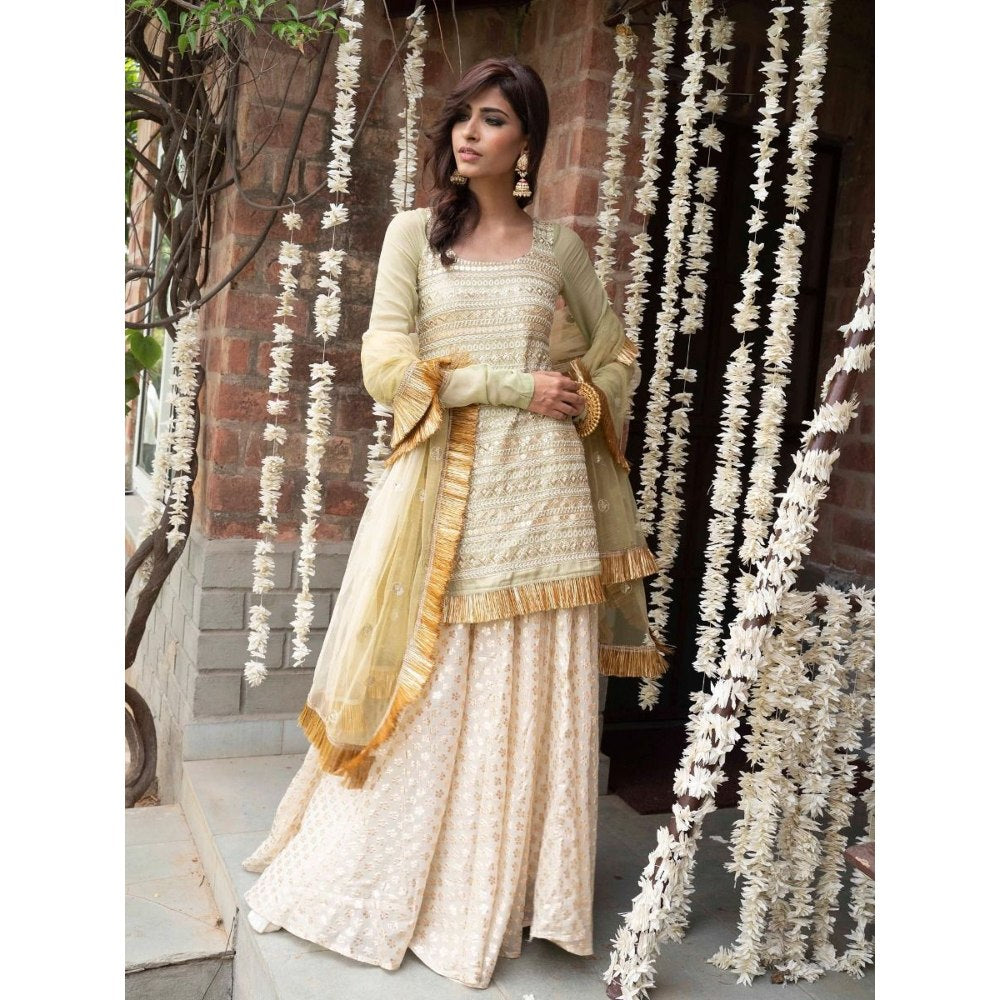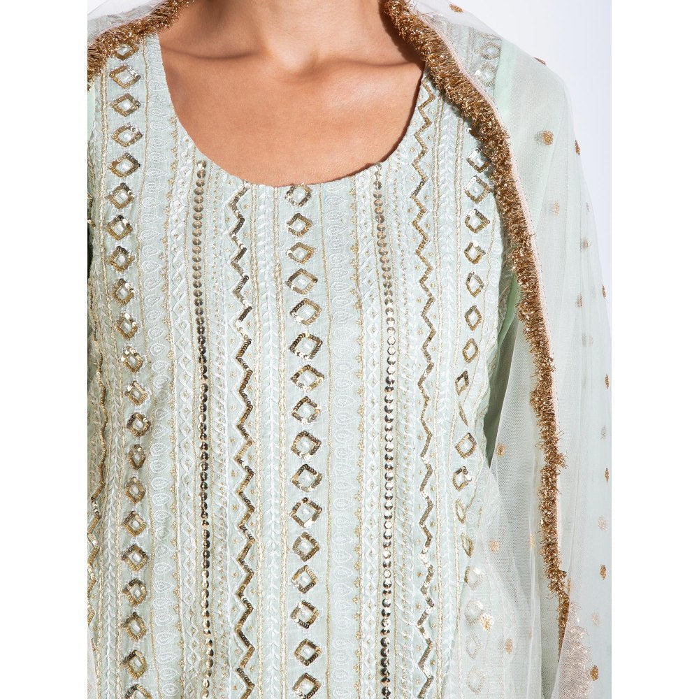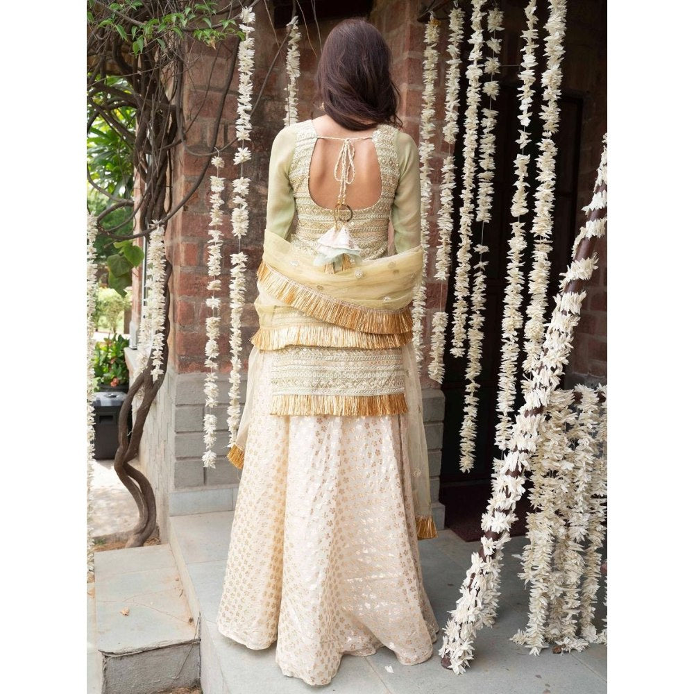 Description : This green kurta and skirt set by Rishi & Vibhuti is crafted in a mix blend of georgette and chanderi and comes with a beige net dupatta. The kurta features a round neck, long sleeves, a dori tie-up details at the back, gota work and embellishment details all over, side slits and a regular fit. The skirt features a mid-rise waist, gold foil print details all over and a comfortable fit. Buy this set online and style it with a pair of embellished heels and statement accessories to complete the look.