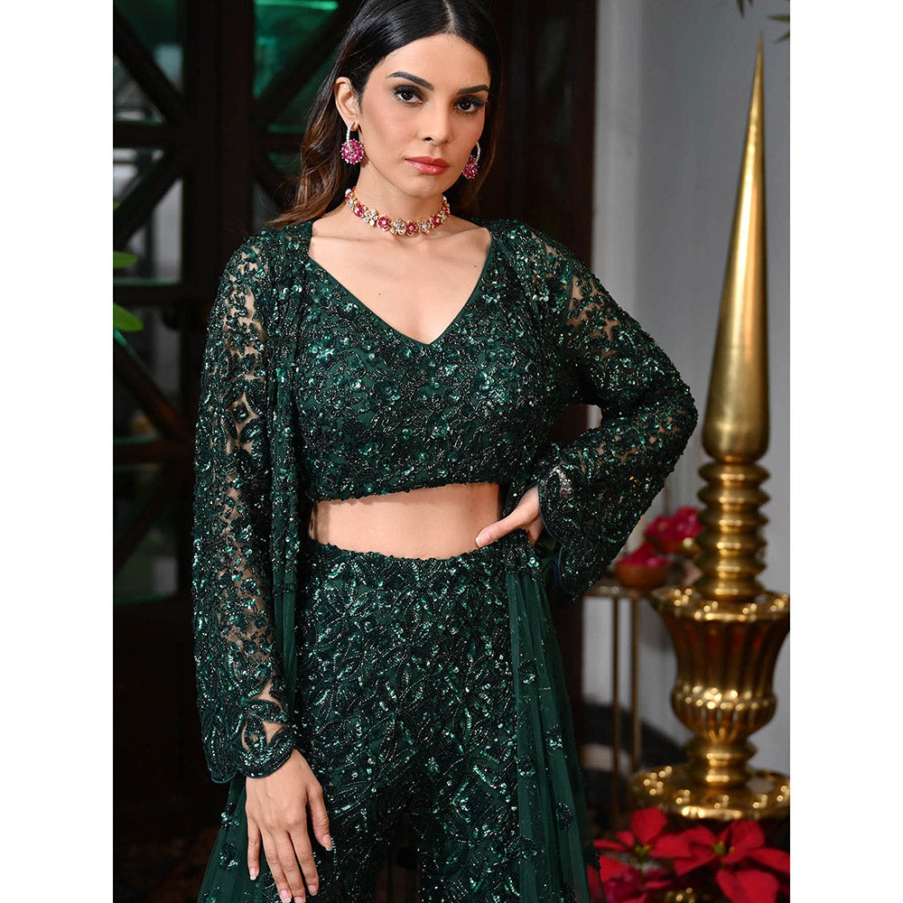 Description : Add a touch of elegance to your wardrobe with this green blouse, palazzos, cape set by Rococo. Made from high-quality blended fabric, it features full sleeves, v-neck style with embellished/sequined pattern, finished with a flared mid waist style. Style it with an elegant watch and heels to complete the ensemble.