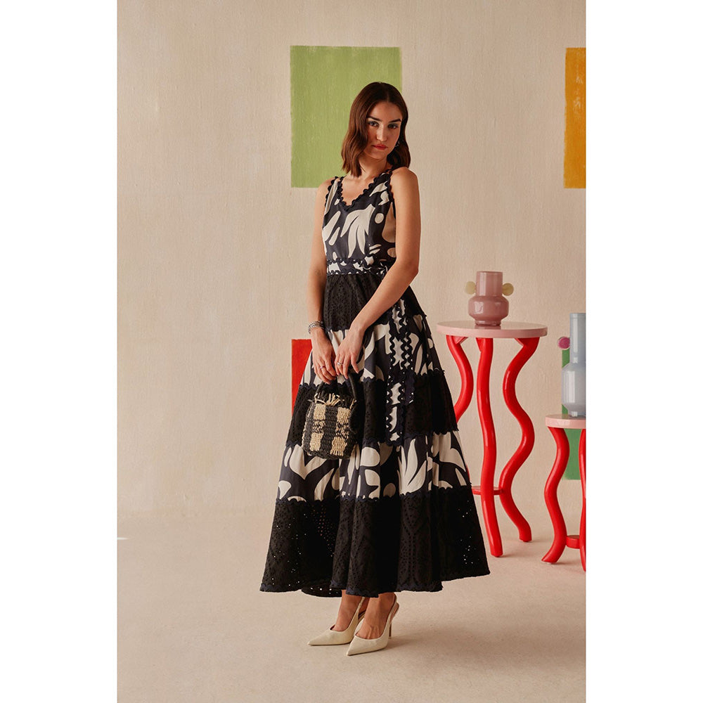 The Elara Dress is a bold yet dreamy take on monochrome dressing. Featuring a mix of soft abstract prints and intricate broderie lace tiers, ita s designed to turn heads with every step.
