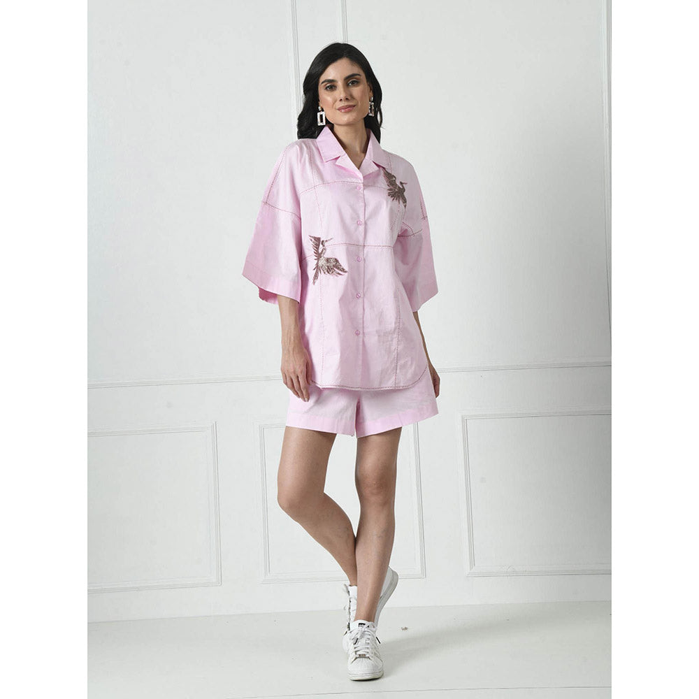 Description : Luxury Cotton Coord Set with Short In Pink Colour Colour with Hand Embroidery Detailing At Front