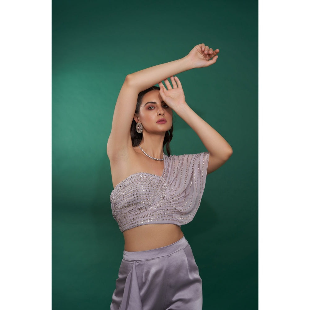 Description : Adorn the styles specially made for you with this lavender set from Suruchi Parakh. Made from high quality georgette, it features pull on closure and embellished pattern along with flared sleeves & one shoulder design. Pair it with trendy footwear to elevate your look.