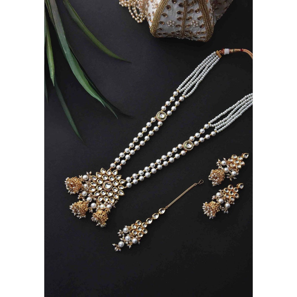 SWABHIMANN Palak White Gold Plated Kundan Long Necklace with Earrings and Maang Tikka