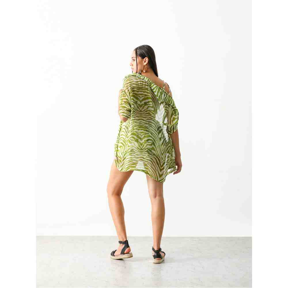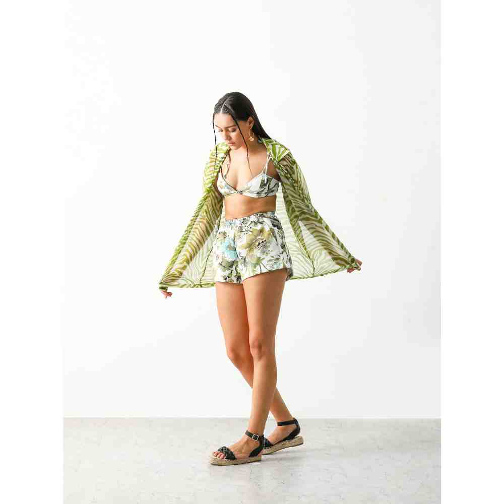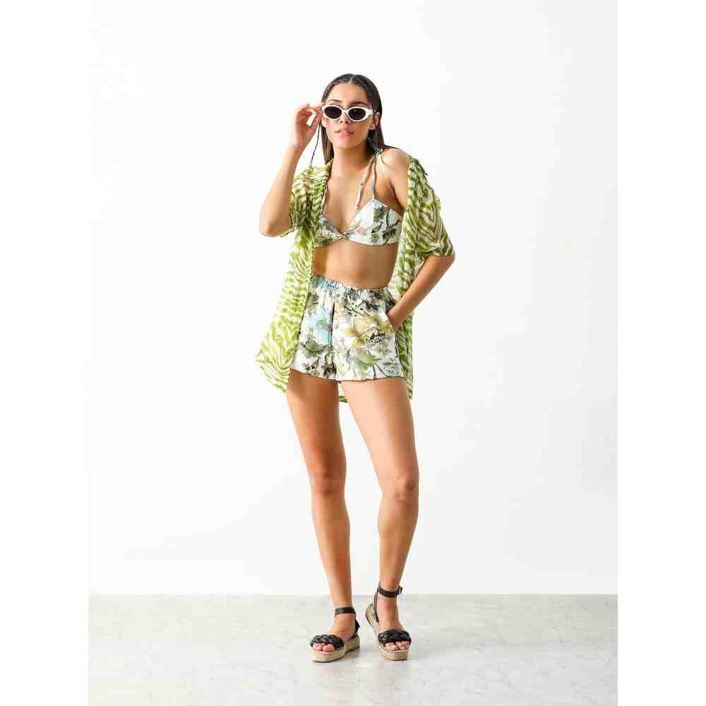 Description : A beautifully designed white & green beach set featuring shirt, bralette and shorts crafted in cotton satin fabric. Tailored to sartorial perfection from premium quality fabric, it assures a soft and soothing touch against the skin. The exquisite silhouette adds to its appeal.