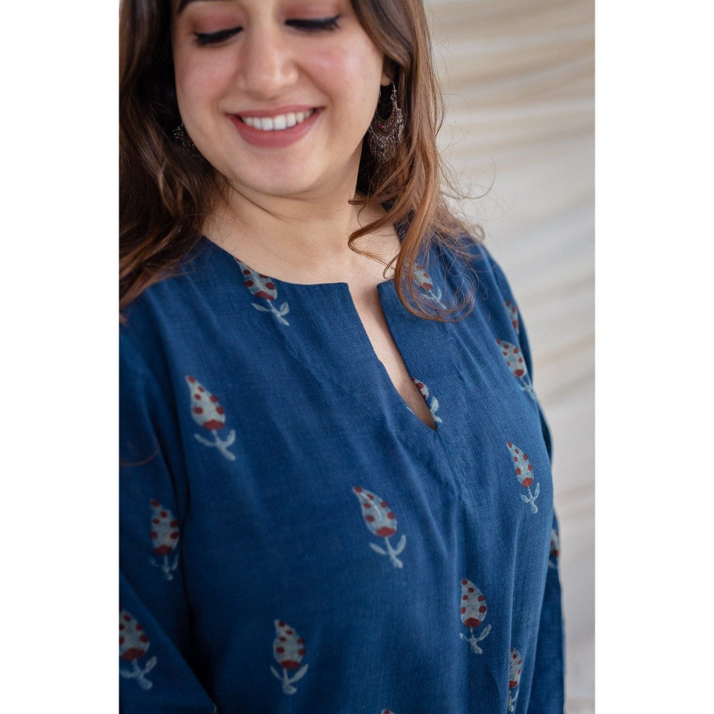 Description : Handcrafted kurta in Bargad hand block prints. This kurta is a wardrobe staple and is super versatile. Features a V neck with 3/4th sleeves kurta. Straight cut kurta with pockets.