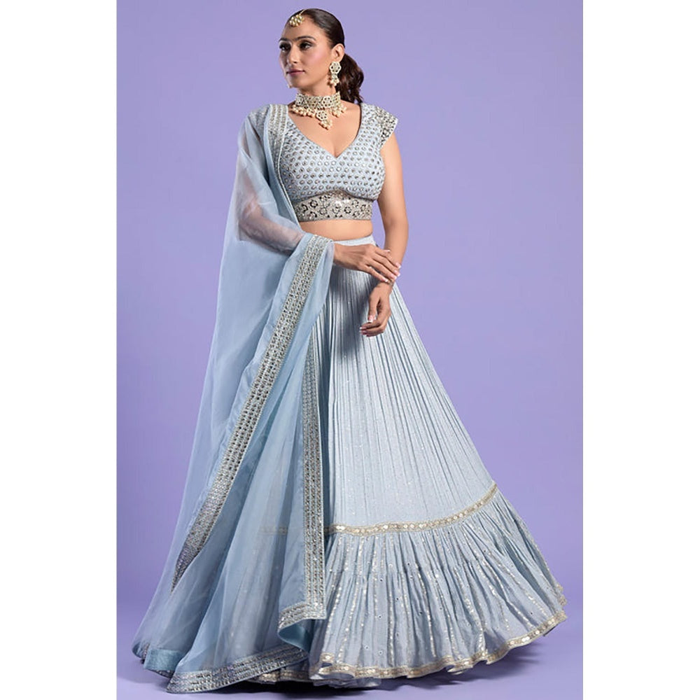 Elevate Your Festive Wardrobe With The Ice Blue And Silver Patra Lehenga Set, A Stunning Creation Crafted In Luxurious Georgette Fabric. This Exquisite Ensemble Features Intricate Zari And Patra Ka Kaam That Lends An Opulent Shimmer To The Flowing Lehenga. The Matching Blouse Showcases A Dense Patra And Zari Jaal, Harmonizing Perfectly With The Lehenga S Detailed Embroidery.