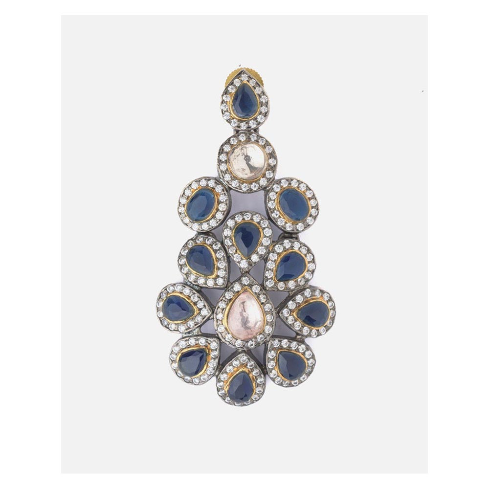 Description : Elegant chandelier earrings featuring deep blue teardrop stones bordered with sparkling crystals. The floral cluster pattern exudes regal sophistication-perfect for festive, bridal, or evening wear.