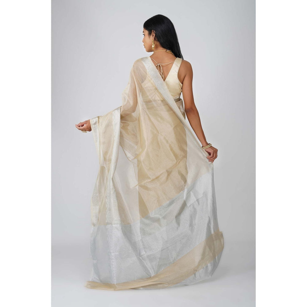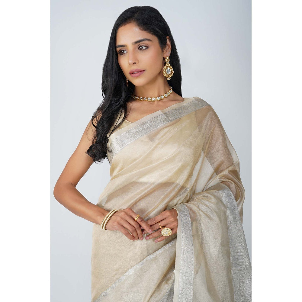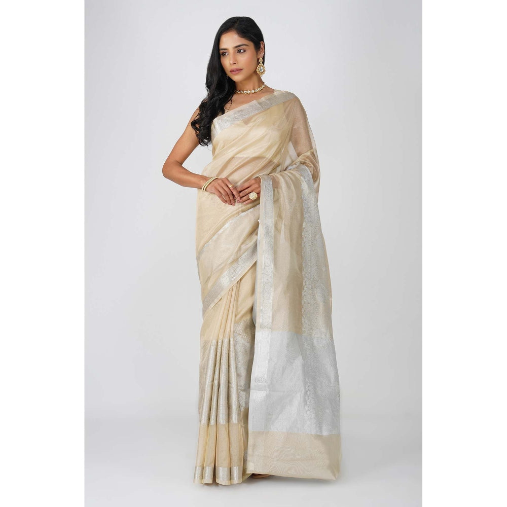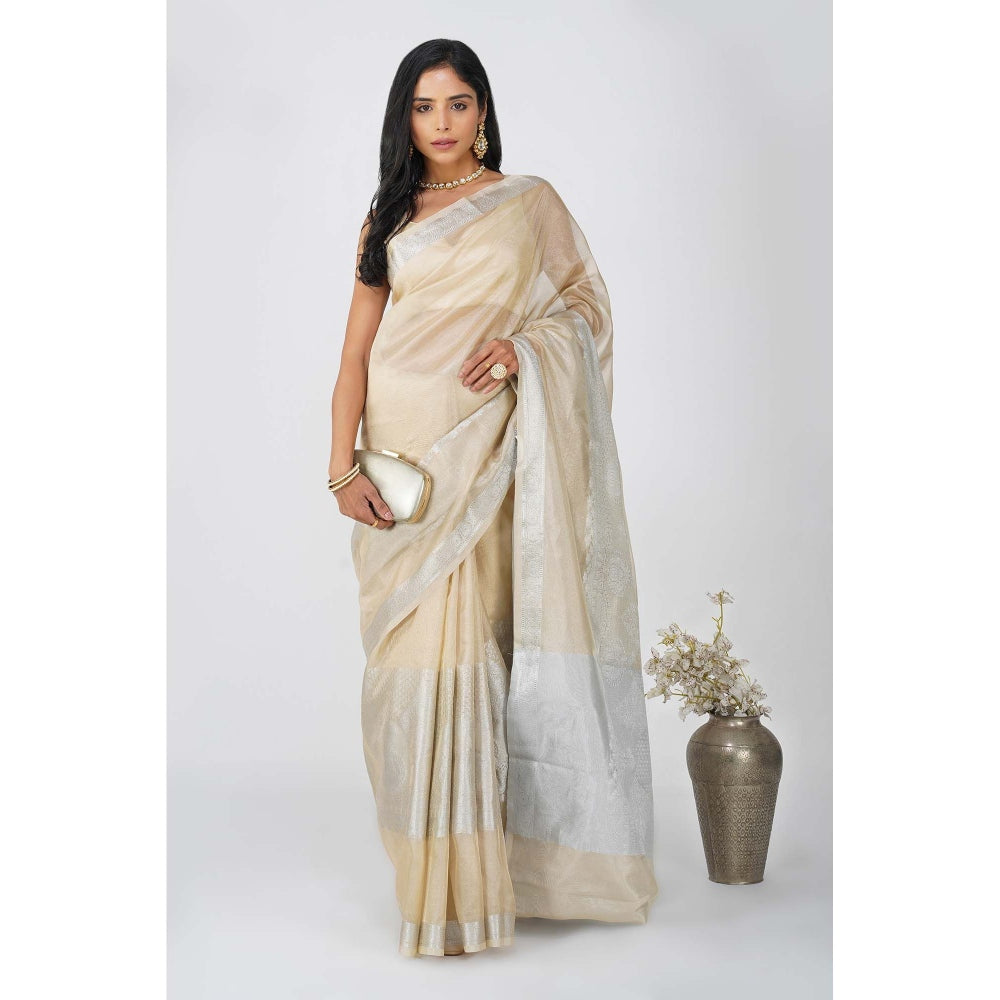 Zal from Benaras Beige Tissue Zari Silk Banarasi Handloom Saree without Blouse