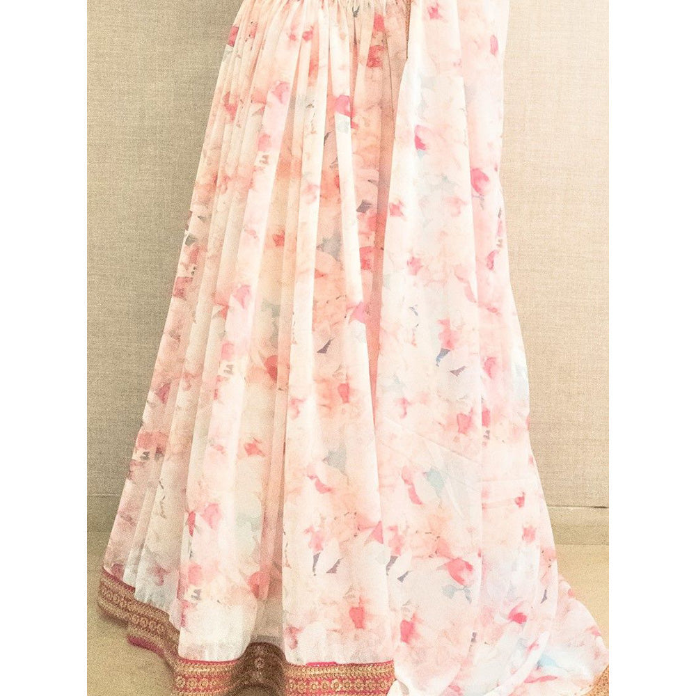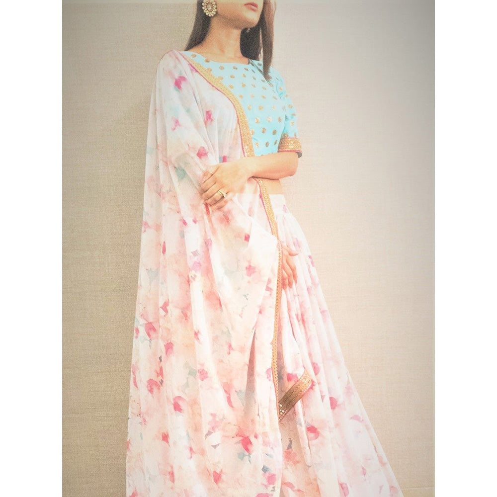 Description : Petal print Lehenga and dupatta with Zari embroidered border on silk. Paired with a a choli in a luxurious crepe fabric with zari work.