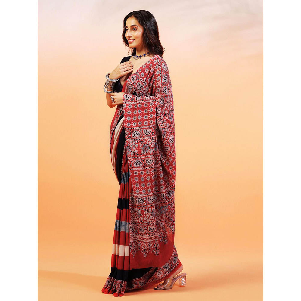 Aditri Handprinted Ajrakh On Cotton Multi-Color Saree With Running Blouse