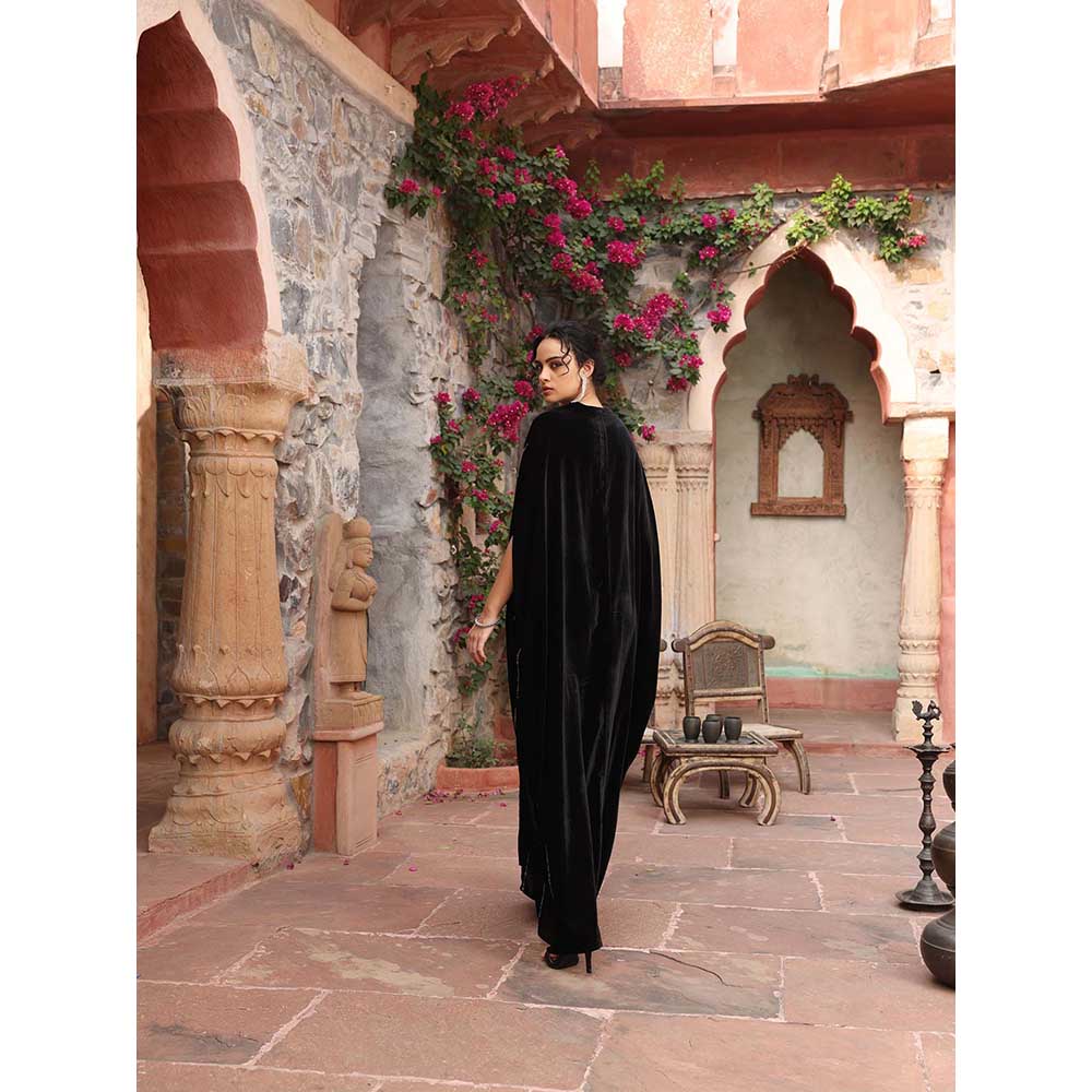 Description : Elevate your style with this intricately embroidered kaftan dress. Crafted from velvet, it is designed with flared sleeves and a V-neck.