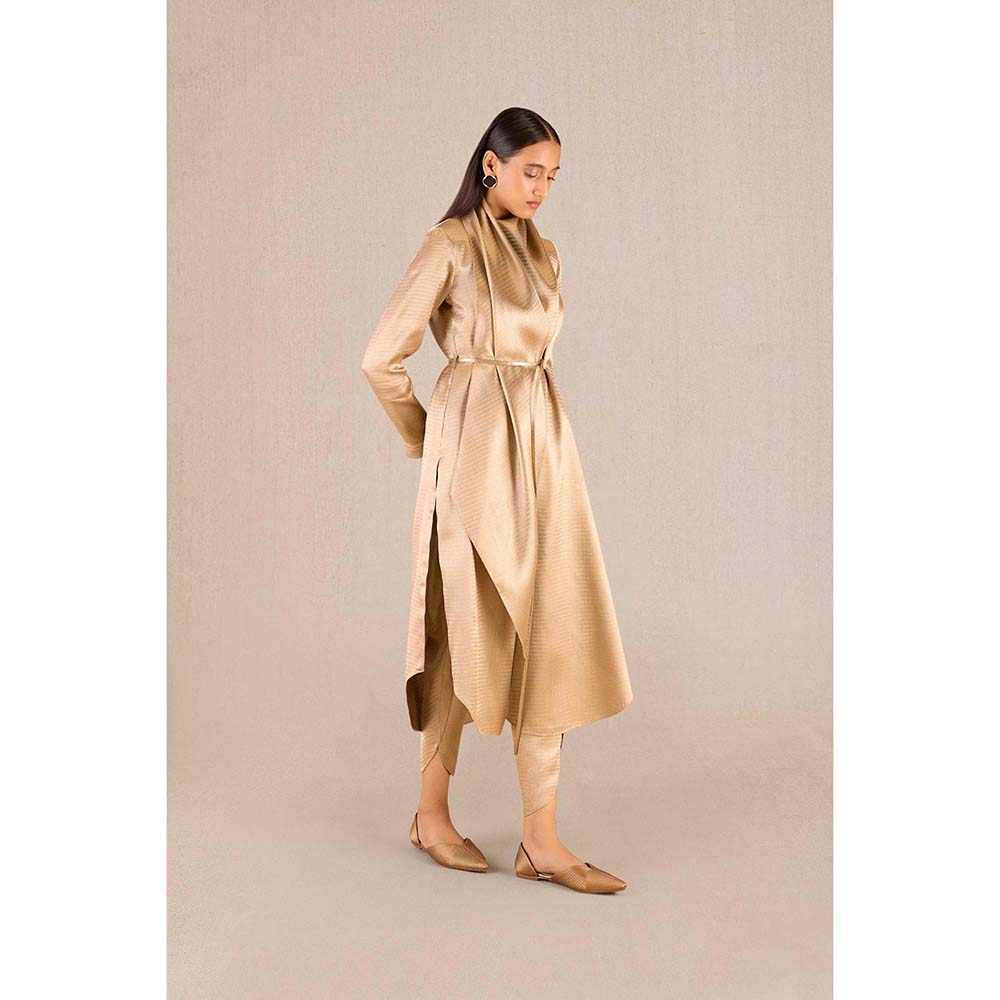 Ruhma Gold Textured Full Sleeves Kurta with Dhoti and Belt (Set of 3)