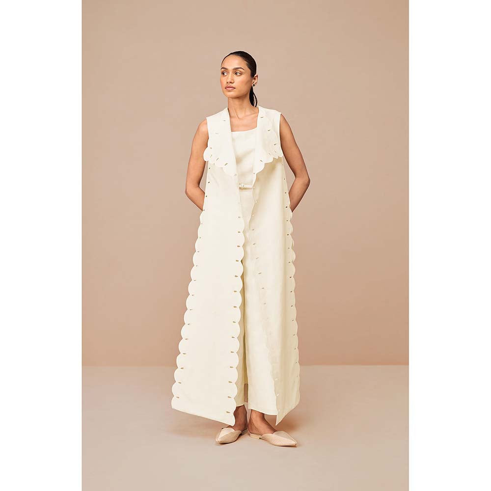 Description : Cleo Jacket Set Precise Dori Embroidery Borders The Carefully Hand-Cut Scalloped Edges Of This Set's Throw. With Detailing Like That, Cleo Is The Epitome Of Effortless Luxury. Made Of The Lightest Cotton Linen, This Set Is Perfect For Sticky Summer Days. Accompanied By An Inner And Dhoti Inspired Pants In The Same Deep, Rich White Like Freshly Tilled Earth The Entire Set Is Cinched Together By A Faux Leather Belt. Pair Cleo With Our Ninah Mules In Pearl White For A Day Spent Out In The Sun.