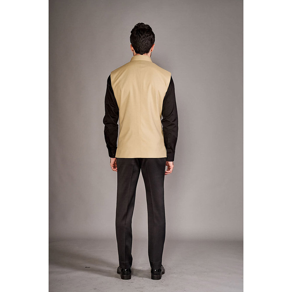 Description : Beige Classic Bundi With Black Chinese Collar Shirt. Tailored to sartorial perfection from premium quality fabric, it assures a soft and soothing touch against the skin. The exquisite silhouette adds to its appeal.