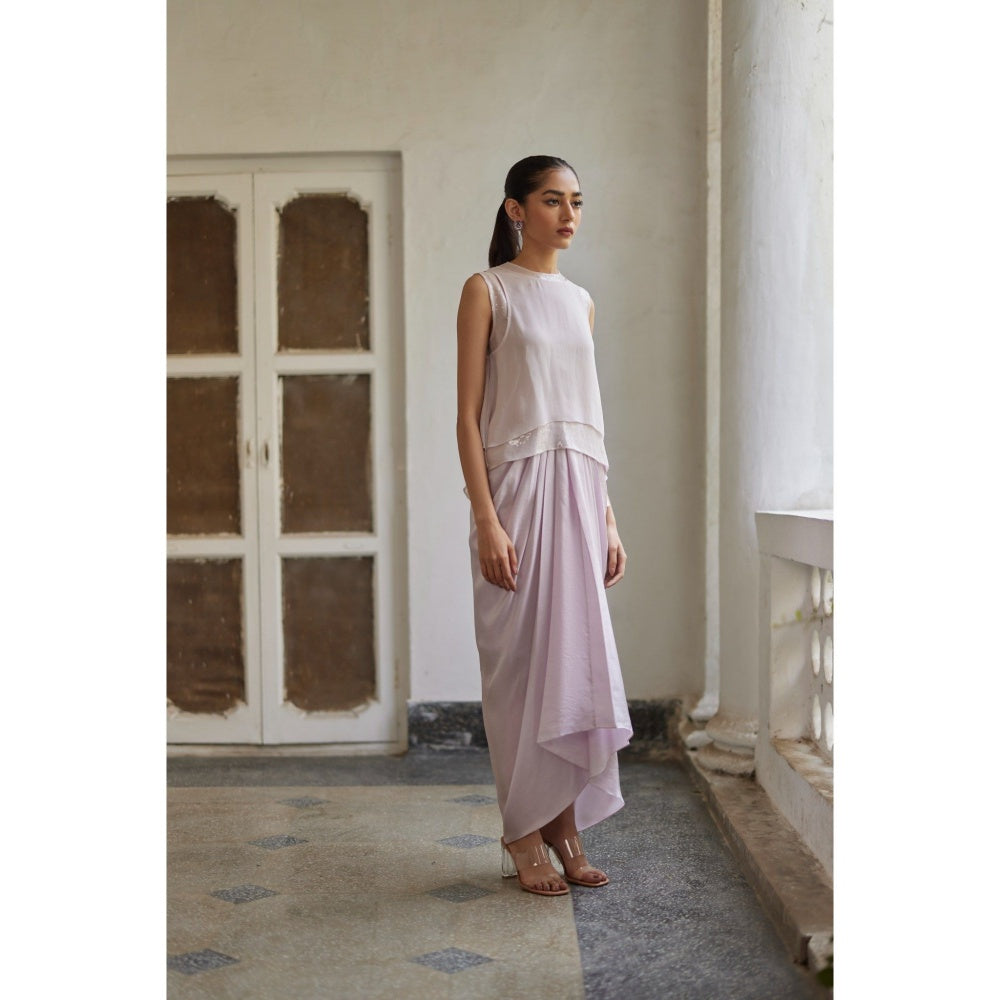 Description : Georgette Sequins Lilac Blouse With Two Layers And Asymmetric Hem Style. Top Has Back Button Opening And Round Neck . Match It With The Beautiful Drape Skirt In Lilac Silk Twill To Get The Complete Stylish Co-Ord. Or Even Better Style It With The Lilac Biker Jacket For The Ultimate Statement Look.