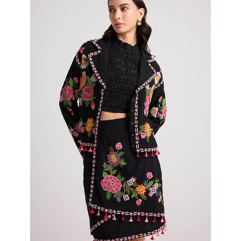 Description : Black Kala Cotton Floral Threadwork And Beadwork Skirt.