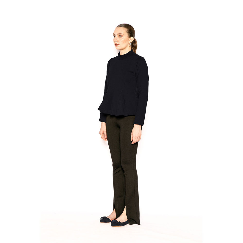 description : A long-sleeved top featuring a high mock neck with a rib finish. Features a slim fit with gored panels at the hem to create a flared peplum silhouette, and a slip-on closure, offering a highly structured and feminine fit.