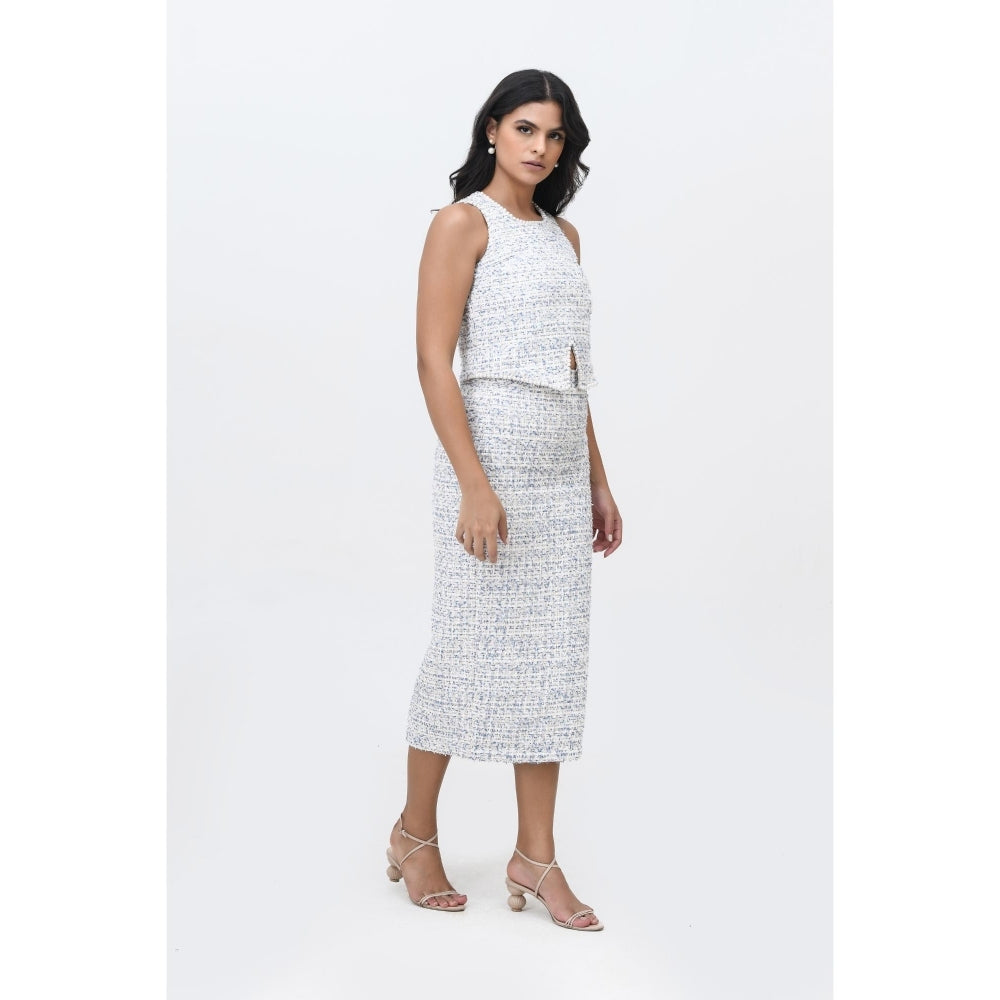 Description : A Sophisticated Skirt Set Crafted From Luxurious Tweed Fabric, Featuring A Fitted Midi Skirt and A Sleeveless Top Adorned with Hand-Embroidered Pearl Embellishments. The Top Boasts A Unique Cut-Out Detail At The Waist, Adding A Modern Twist To Its Classic Silhouette. The Skirt Falls To Mid-Calf Length, Complemented By A Side Slit for Ease Of Movement. Perfect for Both Day and Evening Occasions, This Set Effortlessly Combines Elegance with Contemporary Style.
