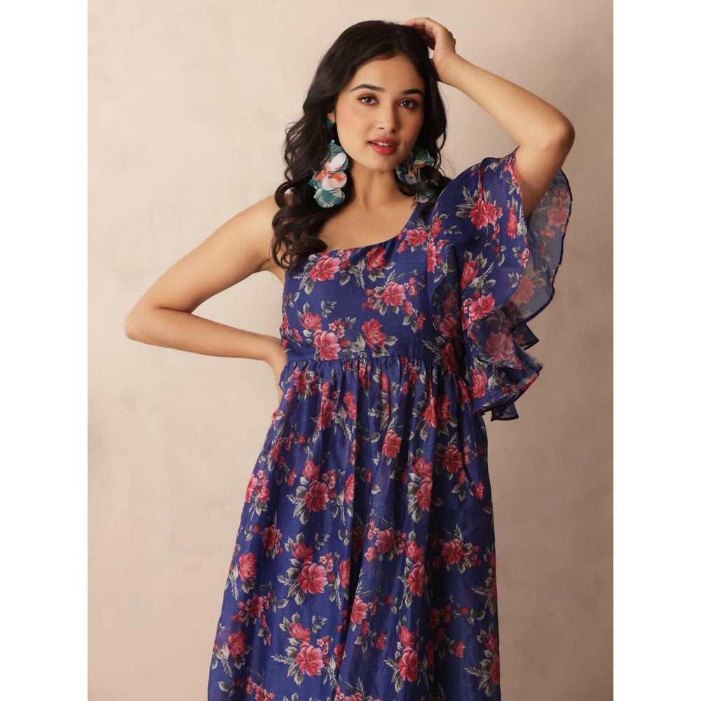 DEASHA INDIA Stella Dark Blue Floral Printed One Shoulder Dress