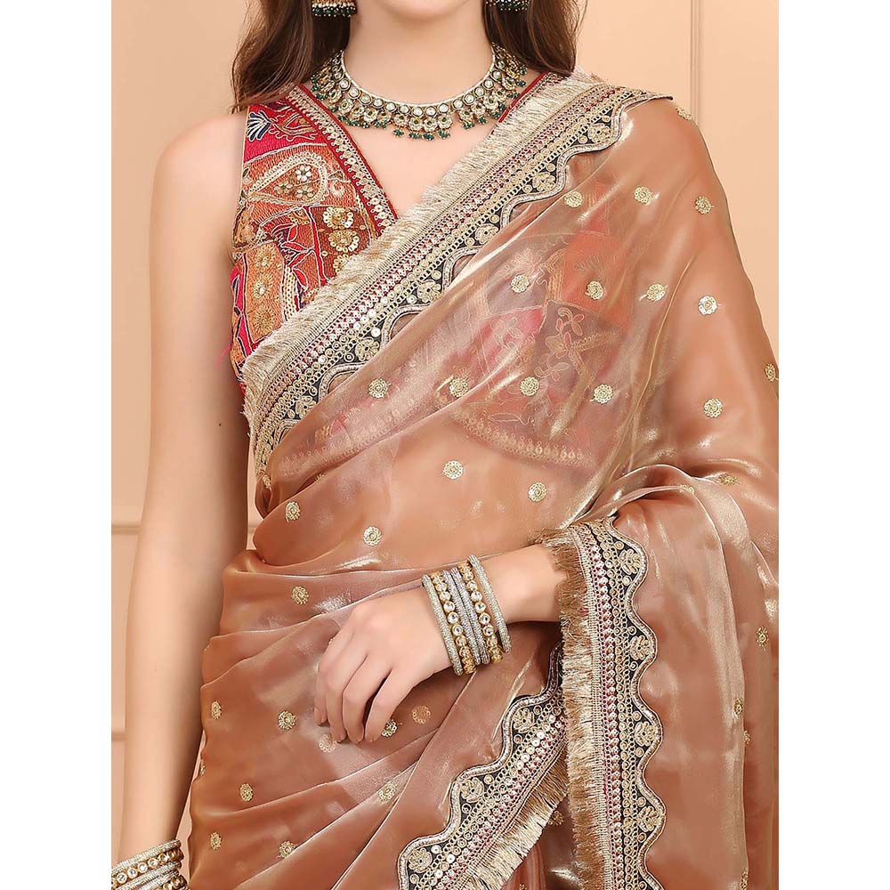 Description : Uniquely Crafted Peach Gold Tissue Saree with Gold Zari Buttis And Detailed Borders. Comes with An Embroidered Embellished Blouse For A Festive Look.