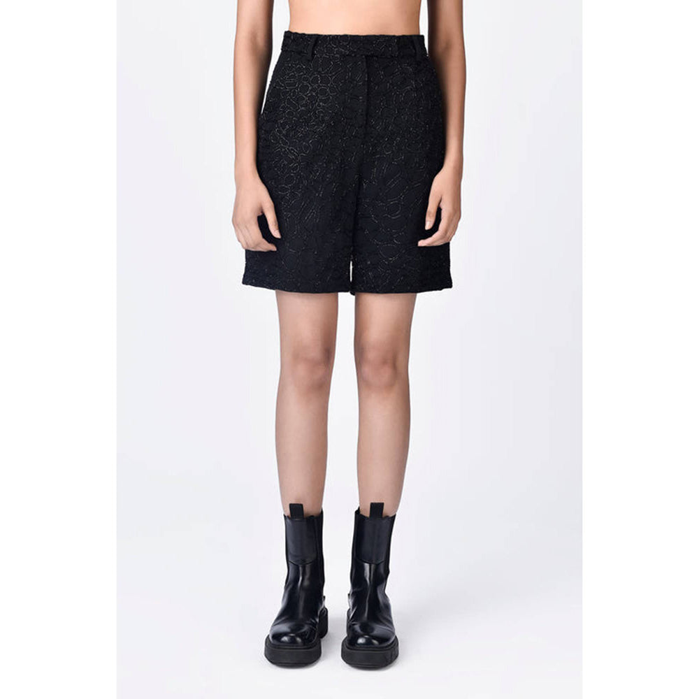 Straight-fit shorts in heavy crepe, featuring tone-on-tone micro cell bead embroidery placement for a subtle yet stylish detail.
