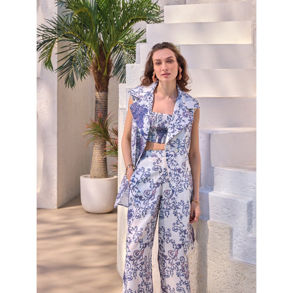 Description : Hello From Paris! Beautifully poised in this Victorian print on light linen blended fabric, our Duomo three piece co-ord makes it simple to easily induct the essence of an airy and elegant style from boardroom to evening style. (Pant)- The straight pants have a sleek and sophisticated appearance, with a tailored fit that elongates the legs. The pants have an elastic at the back for a comfort fit. Adding to the comfortable functionality of these Pants, the cotton pants for women come with Pockets for the Modern fashionable women. (Crop Top)- The crop top features a tube-smoked design, which creates a gathered, ruched effect around the bodice. This style is both flattering and comfortable to wear, as it provides a snug fit that hugs the bust area. This crop top is a part of 3 piece co ord set so pair up with Jacket and pant to complete the Look to attain the perfect summer look. (JACKET)- The notch collar sleeveless jacket adds a touch of elegance and sophistication to the overall look. This jacket for women has a sleeveless design , which allows for a free range of movement and keeps the wearer cool and comfortable. The notch collar adds a refined touch, while the straight-cut hemline with asymmetric flaps creates a modern stylish silhouette.The tailored cut and elegant design make it suitable for any occasion, from formal business meetings to casual dinners with friends. Jacket Length - 32