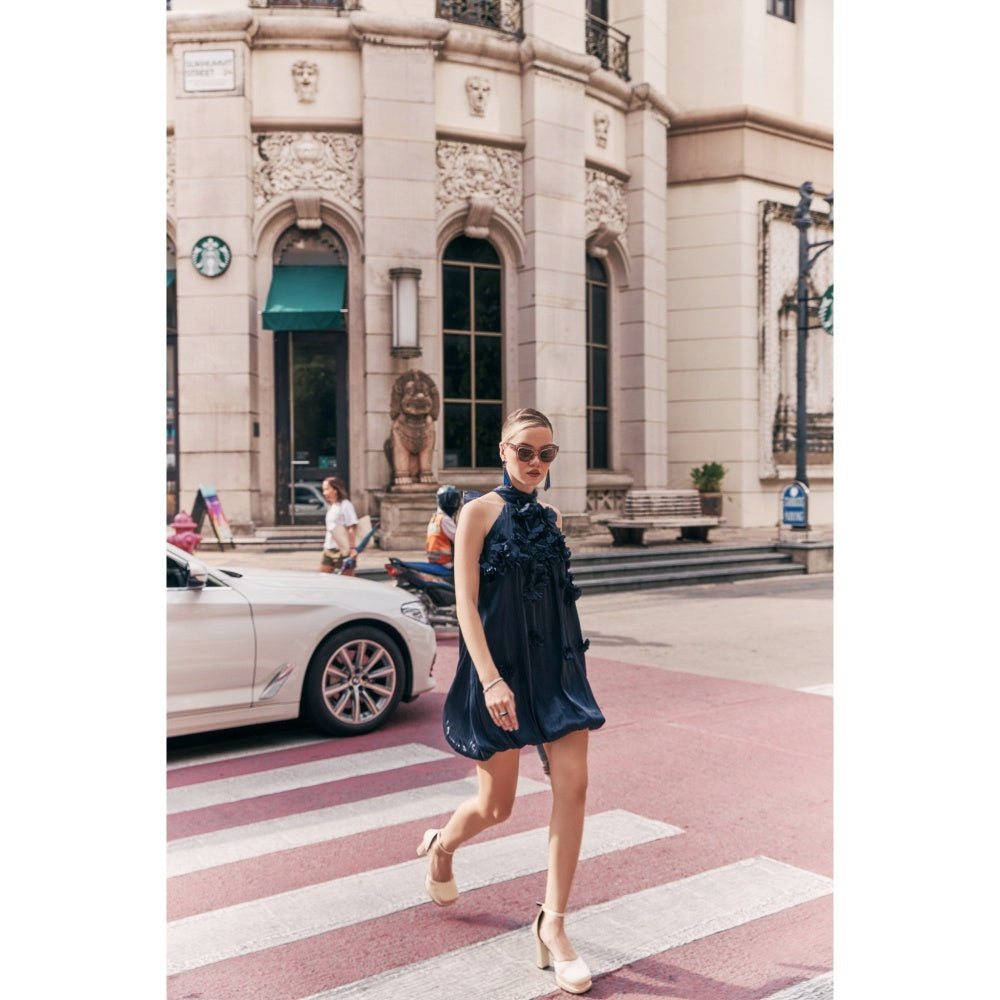 House of Fett Manhattan Organza Puff Navy Blue Dress With Surface 3D Flowers