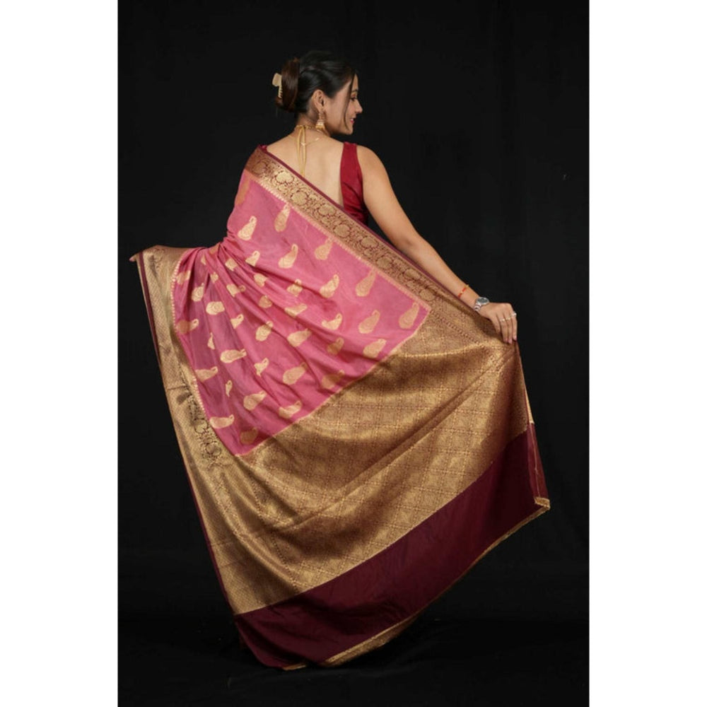 Womens Paisley Zari Pink Pre-Draped Saree With Unstitched Blouse