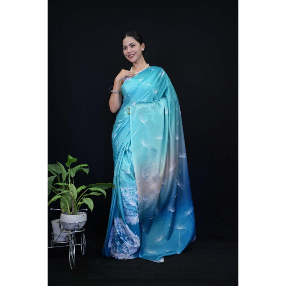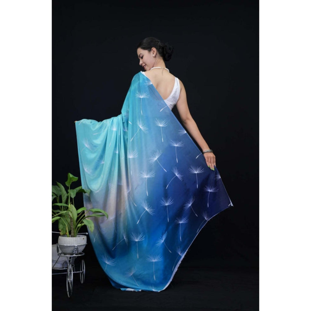 Womens Printed Blue Pre-Draped Saree With Unstitched Blouse