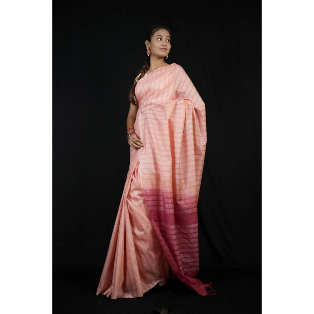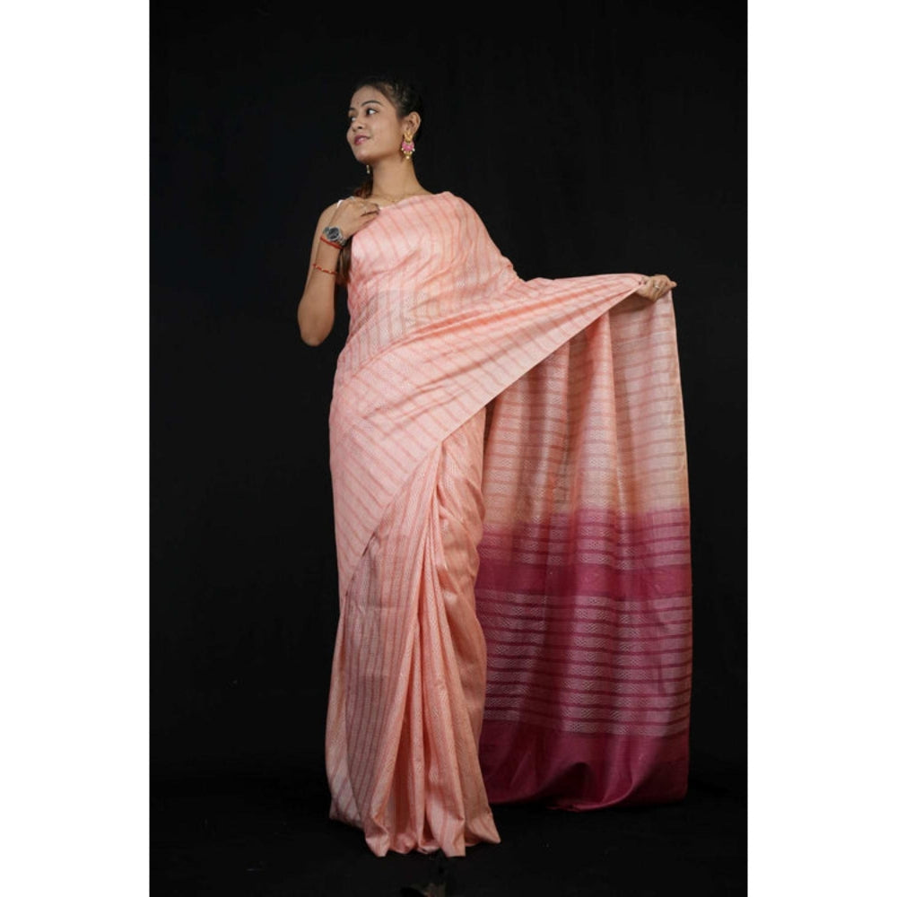 Womens Stripes Tassels Pink Pre-Draped Saree With Unstitched Blouse