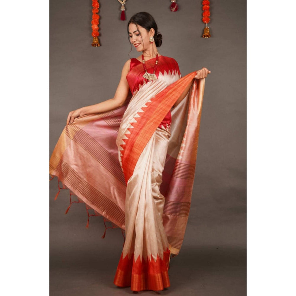 Womens Woven Tassels Beige Pre-Draped Saree With Unstitched Blouse