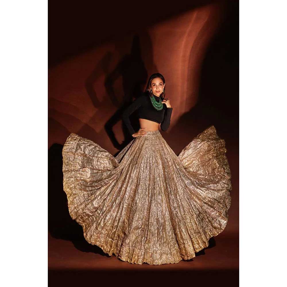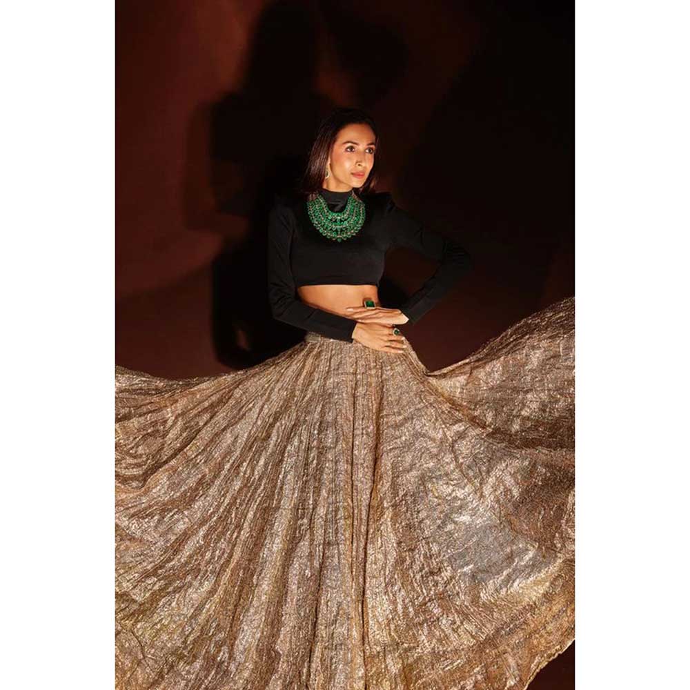 Description : The Woven Zari Gherdar Crinkled Lehenga With Velvet Full Sleeves Blouse