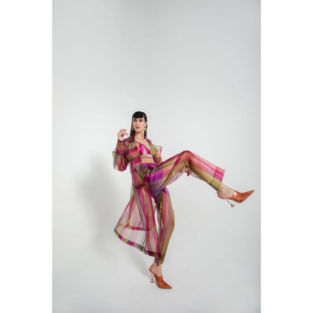 Sheer Trench Coat withHalf Lined Sheer Pantsand V Neck Bandeau