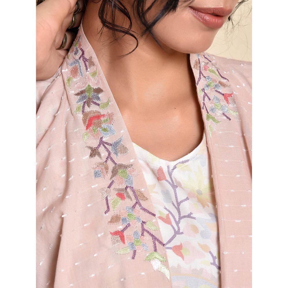 Description : This set by Kanika Sharma includes a white midi tunic crafted in cotton and a dull pink dobby cotton ghera style jacket. The sleeveless jacket features kashmiri hand embroidered work on the collar. The tunic falls just below the knee with a tassled string at the waistline witha fun and flirty floral print. Style it with heels or mojris and gold jewelry for an elegant evening look.