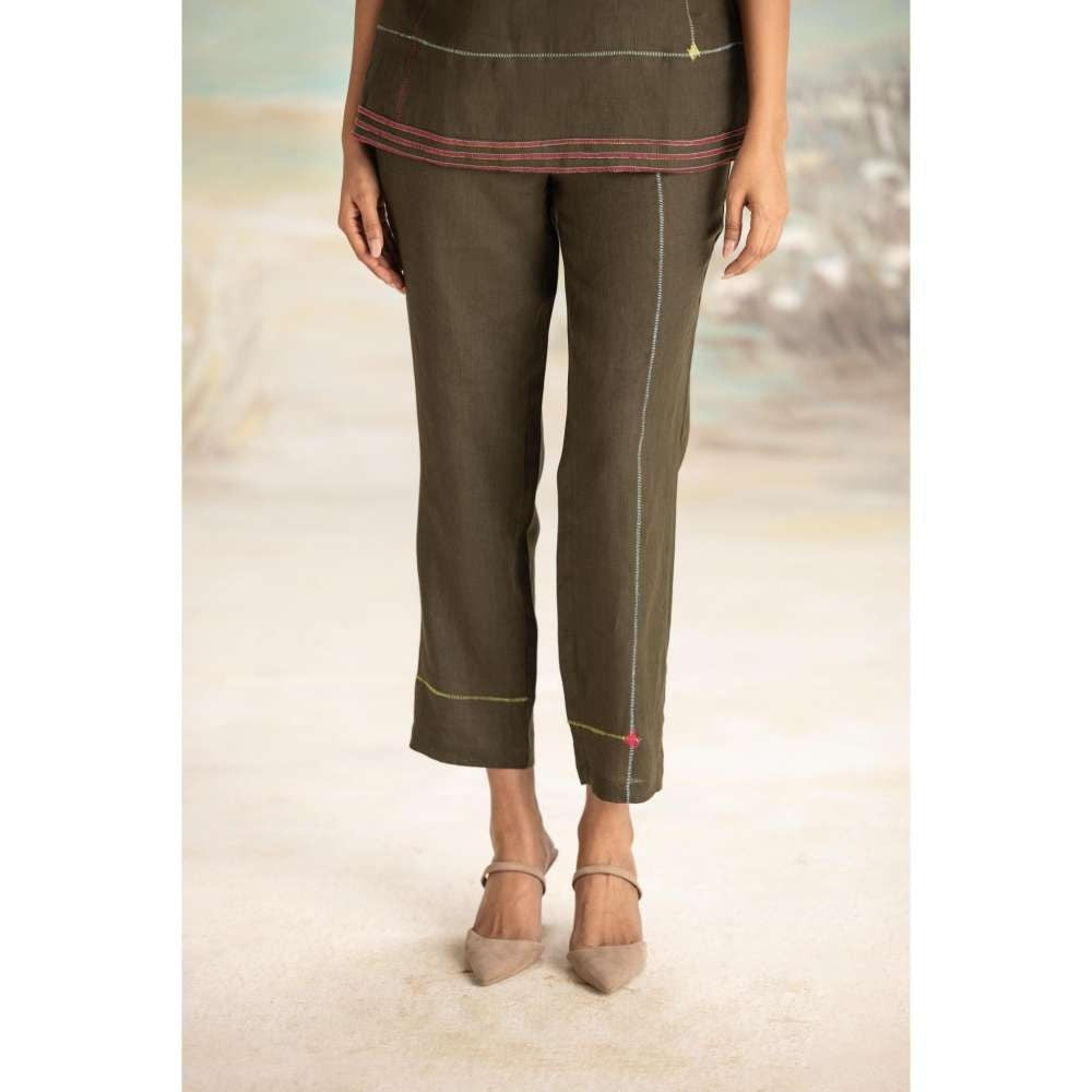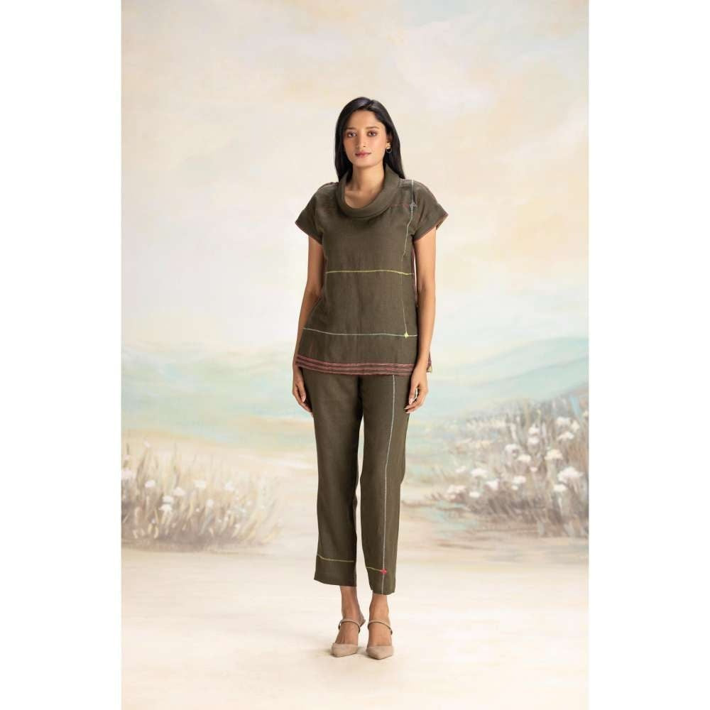 Description : 100% Linen Top Length 26'' / Pant Length - 36" / Model Height 5'9" A Linen Round Roll-Collared Top With Unique Overlocked Seam Lines In Contrast Colours, Adding Perfect Design Detail To The Garment. Paired Effortlessly With Our Signature Cigarette Pants. Relaxed Fit Mild Machine Wash