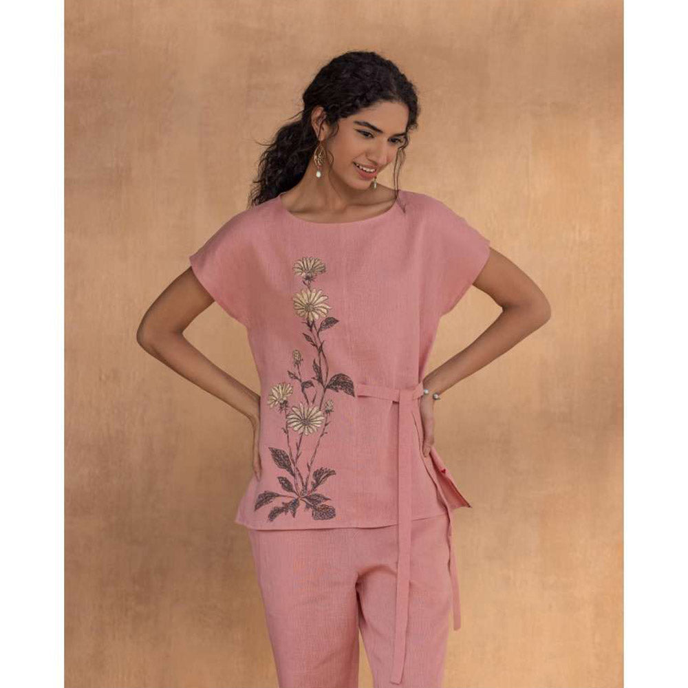 Description : Get festive-ready with this pink co-ord set from Kaveri. Crafted from linen, this beautiful set is finished with half sleeves and a round neck. Style it with a pair of heels and statement jewellery.