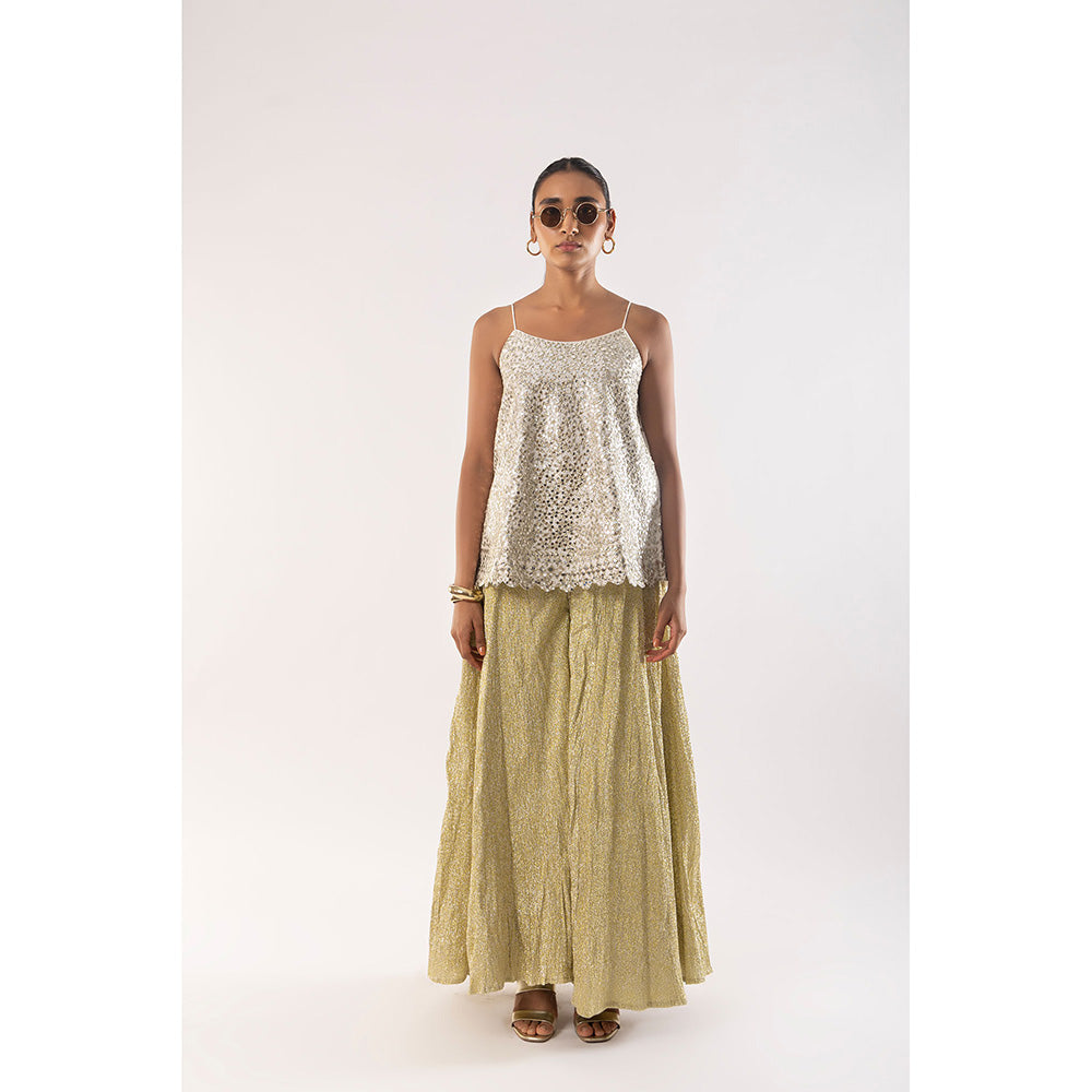 Description : Get festive-ready with this white palazzo set from Kriti Bapna. Crafted from silk, this beautiful set is finished with a sleeveless design and shoulder straps. Style it with a pair of heels and statement jewellery to complete the look.