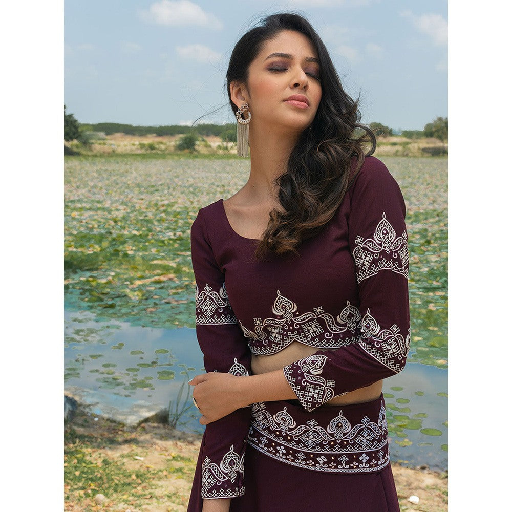 Description : Our Royal Wine Lehenga Set with Embellished Belt is inspired by the craft of Kutch embroidery. The Lehenga set carries intensive embellishments which have been hand-stitched using silk threads. The use of silk threads, commonly known as resham have been quite common in India. The Lehenga Set is an ideal ode to the Indian craftsmen and artisans.