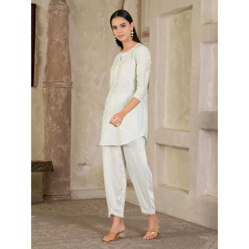 Description : Delicate and dreamy, this sky-blue co-ord set in fine Chanderi fabric features soft leaf motifs and subtle lace detailing along the neckline and sleeves. The kurta is paired with relaxed carrot-fit pants that mirror the lace finish, creating an effortlessly graceful ensemble ideal for summer soirees or casual festive wear.