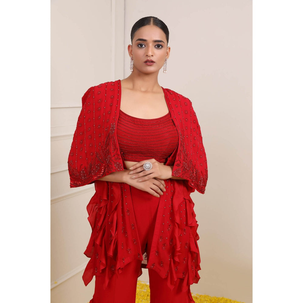 Miku Kumar Red Amina Ruffled Cape with Bustier and Palazzo (Set of 3)