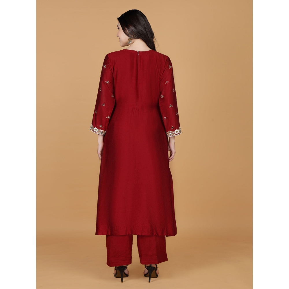 Maroon Self Katan Pearl Mirror Embroidery Kurta with Palazzo & Dupatta