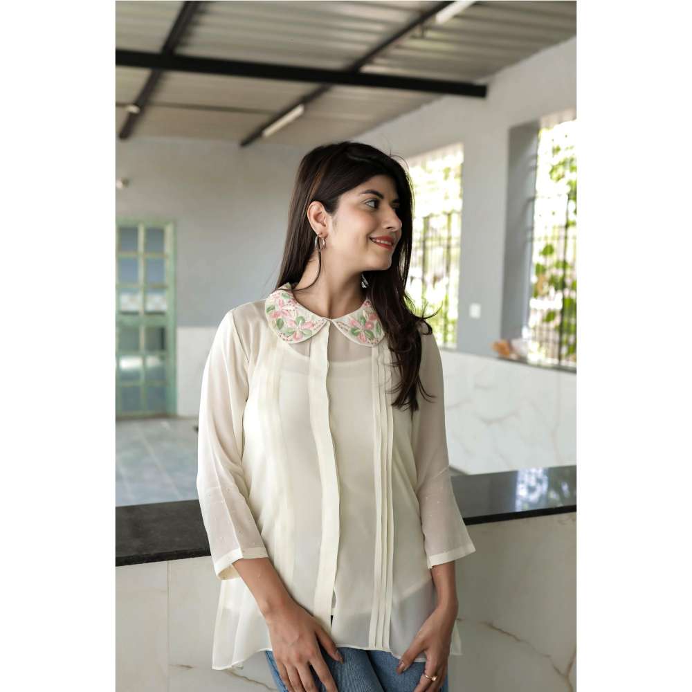 Description : Classic And Refined, This Off-White Shirt Features Intricate Embroidery On A Structured Collar, Blending Simplicity With A Hint Of Sophistication.