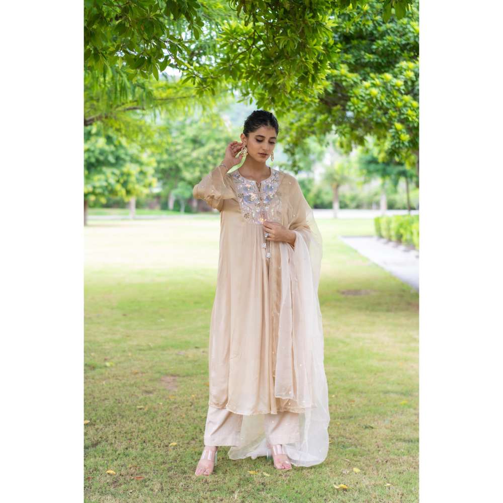Description : Drape Yourself In Sophistication With This Tuscan Beige Suit Set, Featuring Intricate Embroidery And Shimmering Sequins Work Around The Front Neck. The Design Is Elevated With Delicate Hanging Tassels, Adding A Playful Yet Elegant Touch To The Ensemble.